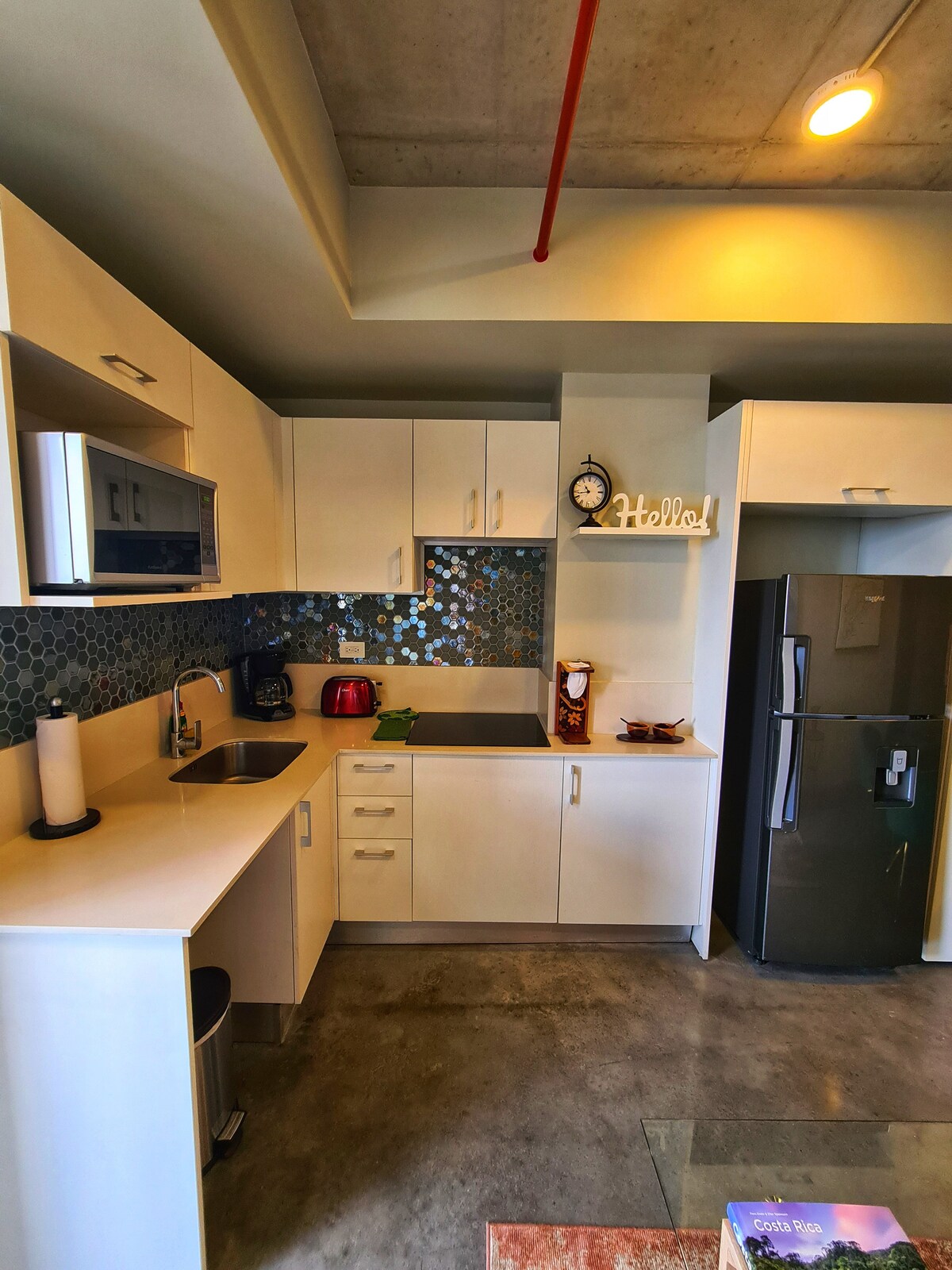 Zupełnie nowy, luksusowy apartament w Nucleo Sabana. Ma minimalistyczny styl ze wszystkimi nowymi urządzeniami, w tym klimatyzacją, 2 telewizorami Smart TV. Szybki internet z usługą TV. Pralnia zawiera pralkę/suszarkę 2 w 1. Z balkonu roztacza się wspaniały widok na wierzchołki drzew i niebo. Obok znajduje się rzeka, więc zawsze możesz cieszyć się jej szumem. Kompleks: ponad 30 udogodnień, w tym rynek gastronomiczny (NucleoGastro). Położony 10 minut od międzynarodowego lotniska Juan Santamaría (SJO).