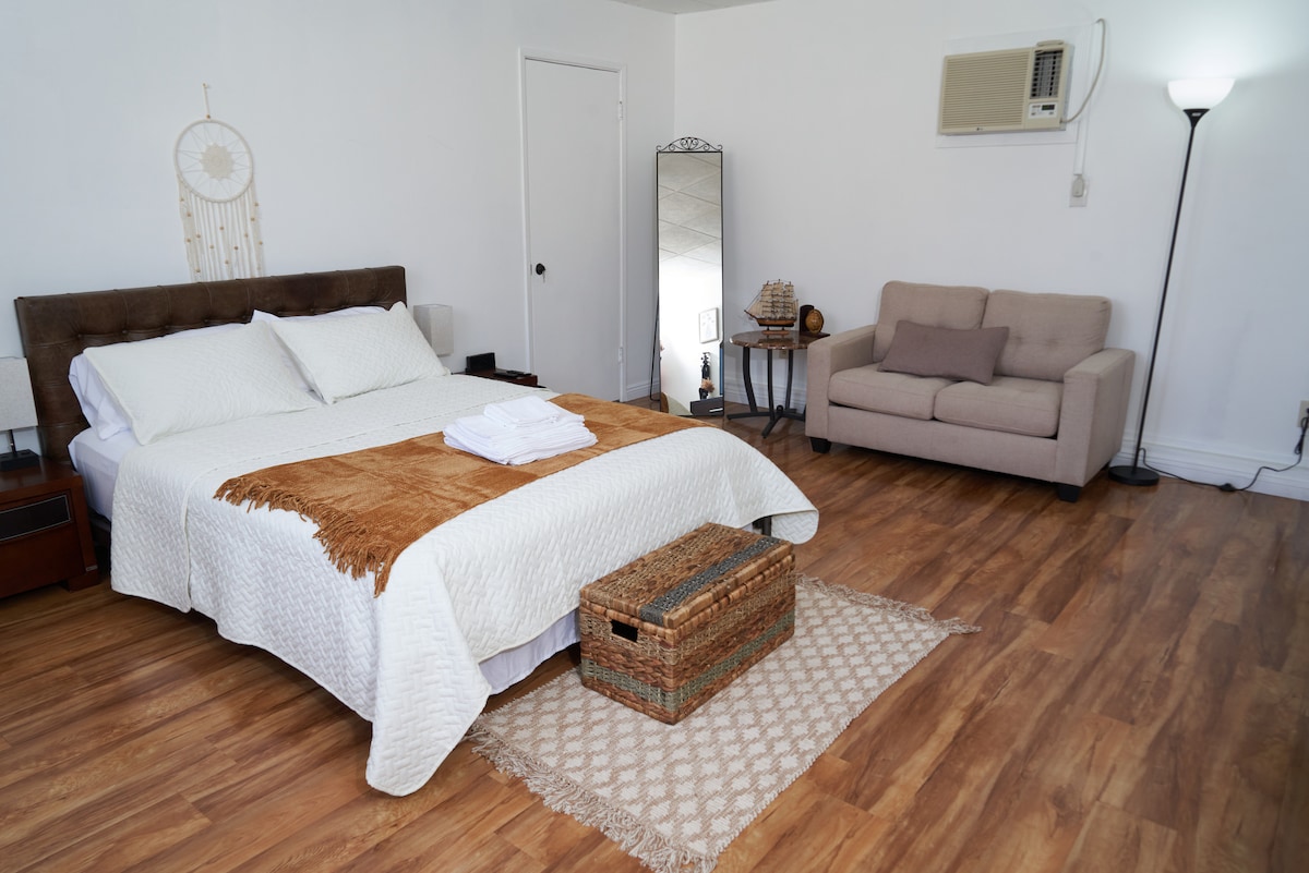 Witamy w naszym nowym, prywatnym studio. To małe studio jest idealne dla podróżującego solo. Posiada prywatne wejście i znajduje się za zabytkowym domem z 1940 roku w spokojnej, bezpiecznej okolicy. Posiada lśniąco czystą łazienkę i aneks kuchenny (bez kuchenki). W aneksie kuchennym znajduje się minilodówka, kuchenka mikrofalowa, opiekacz, czajnik elektryczny i ekspres do kawy. Przestrzeń jest przeznaczona dla jednego gościa i wyposażona w wysokiej jakości łóżko typu twin, pełnowymiarowy stół i pełnowymiarową komodę.