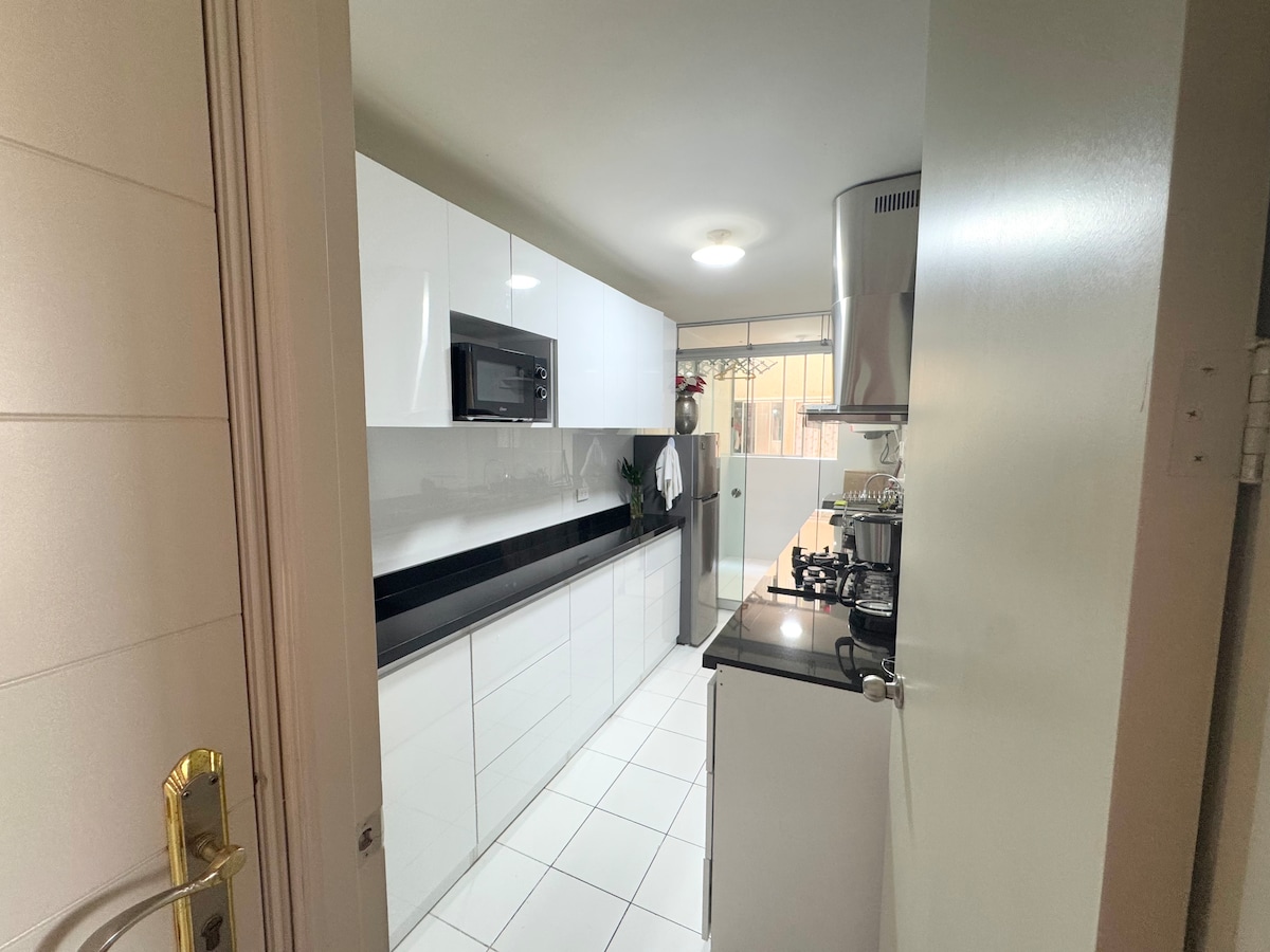 Ciesz się spokojnym i komfortowym pobytem w tym nowym mini mieszkaniu w cichym, centralnym miejscu w Surco. Znajduje się w pobliżu głównych alei Benavides, z dostępem do transportu publicznego, minimarketów i aptek w odległości mniejszej niż 100 metrów Apartament posiada wszystko, czego potrzebujesz, aby poczuć się jak w domu: telewizor, internet, zastawę stołową, nowo wyposażoną kuchnię i wygodne meble.