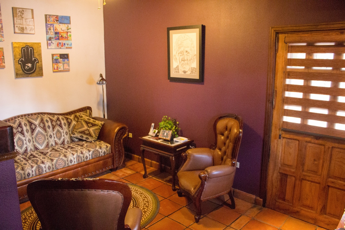 Styl hacjendy, gdzie ogrody, w zgodzie z wystrojem, pozwalają cieszyć się atmosferą spokoju i harmonii. Posiada wyjątkowe miejsca do odpoczynku, czytania i słuchania ptaków podczas kąpieli w fontannie centralnego ogrodu. Dwie przecznice od głównej ulicy. Prywatne i bezpieczne miejsce. Każdy jest mile widziany! / Casa privada estilo Hacienda con jardines que permiten disfrutar de la paz y armonía que ofrecen sus espacios. Dos cuadras de la calle principal. Lugar privado y seguro. Bienvenidos!