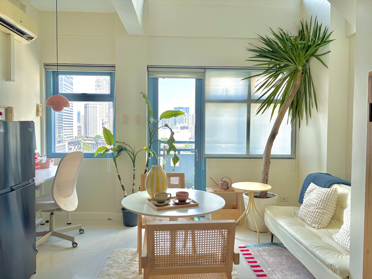 Stylowy, inspirowany Bauhausem i niedawno odnowiony loft o powierzchni 54 m² na 28. piętrze Mosaic Tower, zaledwie kilka kroków od Greenbelt i Legazpi Park. Wysokie sufity, odważne akcenty, łóżko typu queen plus dwie rozkładane sofy, dwa telewizory LG Smart TV, w pełni wyposażona kuchnia i Wi-Fi 50 Mb/s sprawiają, że jest to idealne miejsce do pracy lub zabawy. Zrelaksuj się na balkonie od strony południowej z widokiem na zieloną okolicę. W budynku znajdziesz basen, siłownię, całodobową ochronę i recepcję – wszystko, czego potrzebujesz na pobyt w Makati!