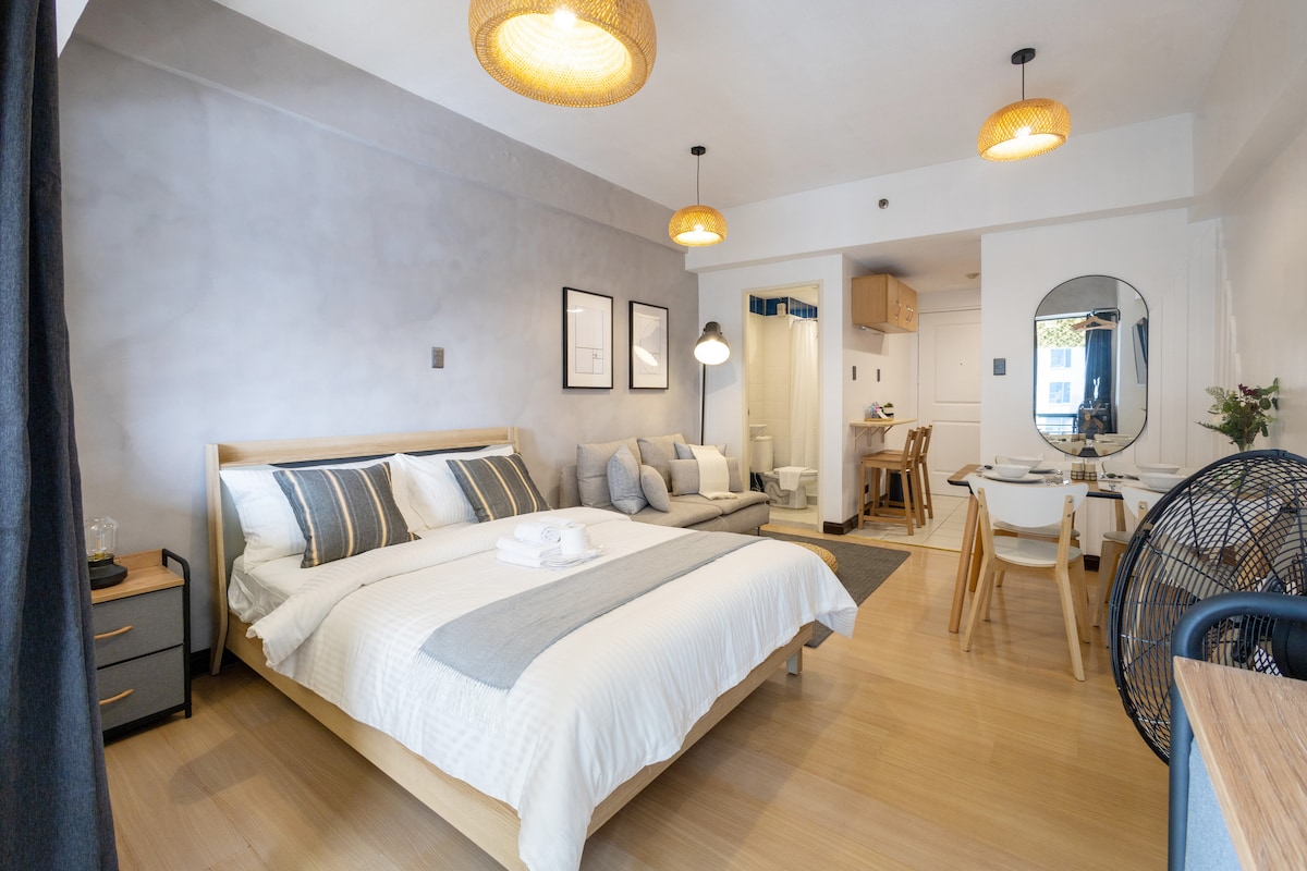 Zatrzymaj się w Mosaic Tower w Makati! Nasze świeżo odnowione, jasne studio znajduje się w odległości krótkiego spaceru od sklepów, kawiarni i lokali nocnych w Greenbelt Mall. Czeka na Ciebie wygodne łóżko typu queen (i dodatkowa sofa), nowoczesny aneks kuchenny, darmowe Wi-Fi 50 Mb/s i smart TV LG z abonamentem Netflix – wszystko, czego potrzebujesz do pracy lub zabawy. Dzięki całodobowej ochronie możesz spać spokojnie w samym sercu Makati. Idealne dla osób podróżujących w pojedynkę lub par, które chcą komfortu i wygody w eleganckiej przestrzeni miejskiej.