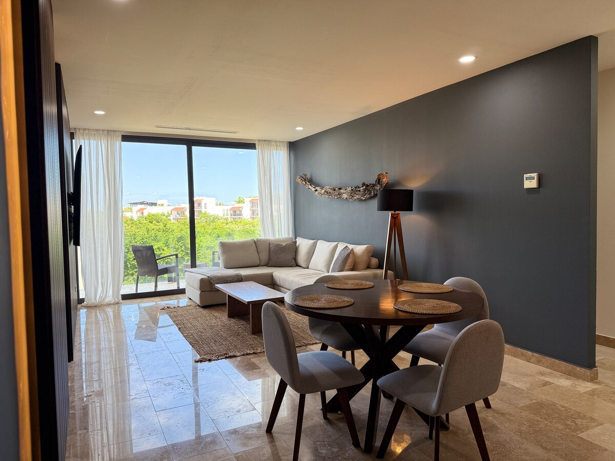 Luksus i komfort w samym sercu Cozumel Zrelaksuj się w tym eleganckim apartamencie z 2 sypialniami i 2 łazienkami, idealnym dla 4 osób. Ta ekskluzywna przestrzeń, położona w nowym (2025) nowoczesnym budynku, oferuje niezrównane wrażenia dzięki najwyższej klasy udogodnieniom i wyjątkowej nadmorskiej atmosferze. ✔ Główna sypialnia z łóżkiem typu King Size ✔ 2 łazienki z toaletą i prysznicem ✔ W pełni wyposażona kuchnia ✔ 2 balkony z zapierającymi dech w piersiach widokami na zachód słońca w Cozumel ✔ Pralka i suszarka