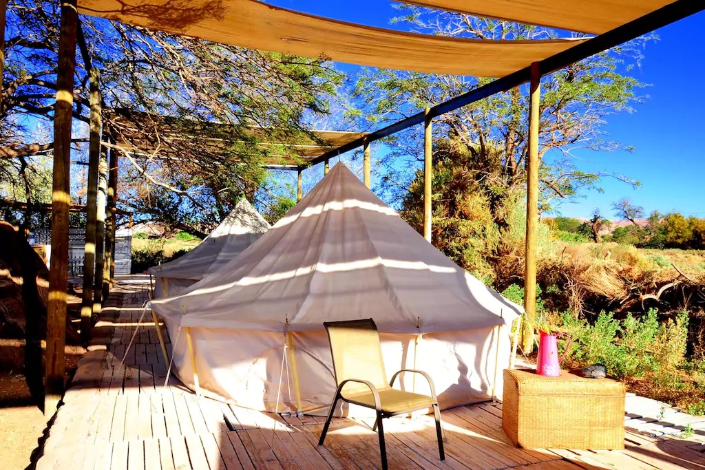 Na zaledwie 1,3 k. od centrum San Pedro, w sercu Oazy, urządzone przez pasma górskie w 360 stopni, znajdujemy 13 ekskluzywnych namiotów 16 do 25 mt.2, z prywatnymi tarasami i opcją łazienki, 2 wspólne kuchnie, grille i kuchenki. Pojemność do 5 osób, w łóżkach pojedynczych lub podwójnych. Idealny dla rodzin i grup. Projektujemy również ekskluzywne wycieczki po okolicy!