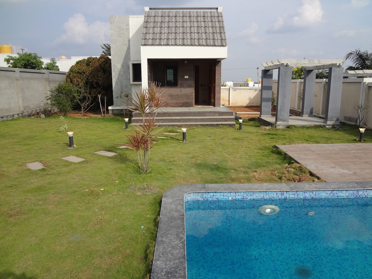 Przytulna willa 2BHK na spokojnej wsi Shoolagiri, otoczona polami ryżowymi. 🏡Wyróżnione: • Prywatny basen do orzeźwiających kąpieli i gier basenowych • Pokład do pływania na lunch/kolację pod gwiazdami • Malowniczy taras z widokiem na okolicę • Minimalistyczne wnętrza z naturalnym światłem • Gry planszowe i tarcza do rzutek do zabawy w pomieszczeniu • Szybkie Wi-Fi, telewizor Smart TV, głośniki i kuchnia • Dostawa jedzenia przez Swiggy/Zomato • Idealne dla par, rodzin, singli • Przyjazne dla zwierząt 🛏Nocleg dla 2–7 osób | 🧘♂️Relaks. Zabawa. Odprężenie