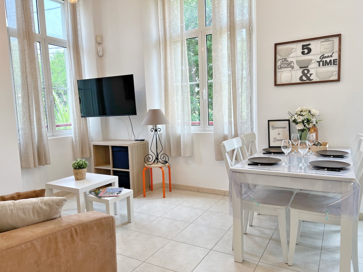 Piękne studio, wygodne, idealnie położone w samym sercu Sanary, gdzie można wszędzie chodzić. Bezpłatny parking. 5 minut od plaż, 2 minuty od portu i targu owocowo-warzywnego każdego ranka Przyjdź i ciesz się uroczymi uliczkami dla pieszych. ze sklepami i restauracjami. Idealne miejsce na udany pobyt w tej pięknej wiosce, jako para lub rodzina. Zarezerwuj już dziś, by odpocząć nad morzem