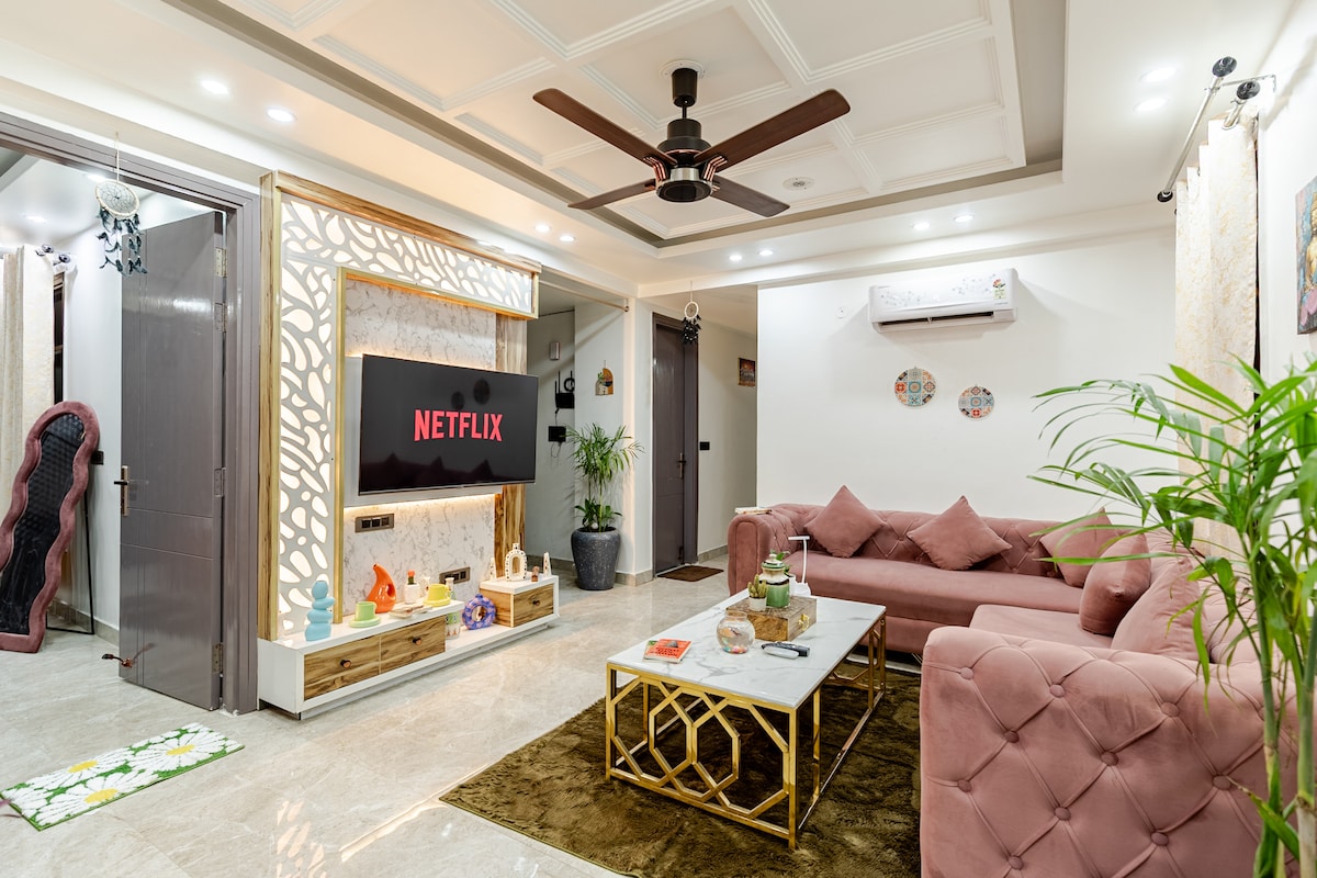 Zatrzymaj się w naszym przestronnym apartamencie z 2 sypialniami i widokiem na park, 8,5 km od lotnisk i 15 minut jazdy od metra. Ciesz się przestronnymi balkonami, widokiem na park, mahoniowymi/drewnianymi łóżkami, w pełni wyposażoną kuchnią, szybkim Wi-Fi, telewizorem Smart TV, bezpłatnymi przyborami toaletowymi i lokalnymi rekomendacjami. Delektuj się domowymi posiłkami, odkryj pobliski targ i centra handlowe oraz zrelaksuj się na spokojnych trasach do joggingu. Doświadcz najwyższej klasy gościnności dzięki elastycznemu zameldowaniu i wymeldowaniu, usługom prania i opcjonalnym transferom z lotniska. Zarezerwuj teraz, aby zapewnić sobie niezapomniany pobyt w Delhi!