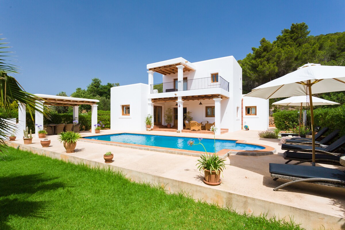 Charming, boutique-style villa nestled in a romantic green garden with old trees & flowers. With its terraces, chillout areas & a lovely little private pool the property offers great space & privacy for 8 to 9 guests. All 4 bedrooms with AC. Internet: high-speed fiber-optic! Within a 6min walk you reach the beautiful sandy beach of Cala Llonga. Restaurants, supermarkets, shops & taxi stand are only a 4min walk away. To Ibiza golf or Santa Eularia it's a 5min drive; to Ibiza Town it takes 12min.