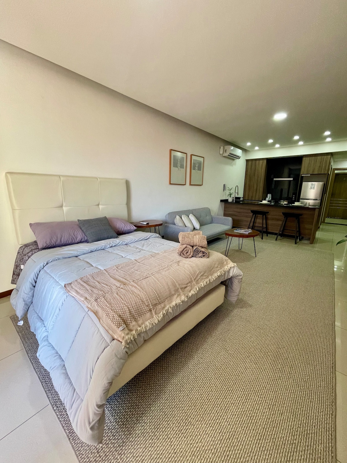 Luksusowe mieszkanie z 1 sypialnią w najlepszej i najbezpieczniejszej dzielnicy Santa Cruz de la Sierra, w pobliźo ważnych punktów miasta. Apartament o powierzchni 50 m2 może pomieścić 4 osoby. Co oferuje to mieszkanie na 5 piętrze: – Salon z 50-calowym telewizorem - 1 sypialnia z łóżkiem typu queen size - W pełni zaopatrzona kuchnia - 1 łazienka - Rozkładana sofa dla 2 osób - Wi-Fi - Środki czyszczące - Kawa, cukier, sól, herbata, olej i ocet - Własny parking Budynek oferuje: - Basen na dachu - Pokój gier i zabaw - Kino - Grill - siłownię