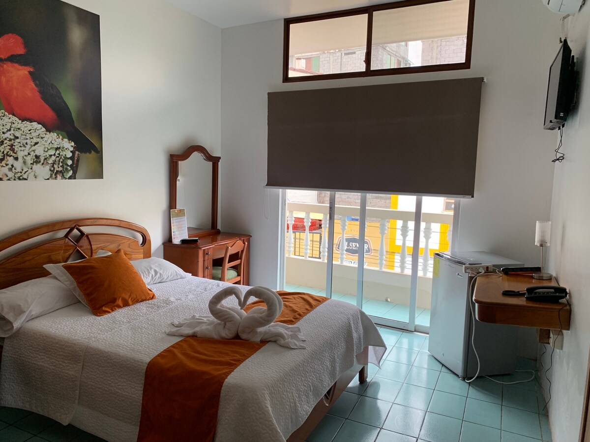 Pokój na drugim piętrze. Pokój wyposażony jest w 2 łóżka typu queen, klimatyzację, prywatną łazienkę z ciepłą wodą i suszarką do włosów. Po zwiedzaniu skorzystaj z naszego basenu. Zapewniamy filtrowaną wodę, herbatę i kawę Galapagueño przez całą dobę, dostępne, gdy ich potrzebujesz. Nasze stawki nie zawierają 15% podatku VAT. Jeśli jesteś z EKWADORU i potrzebujesz faktury, skontaktuj się z nami przed potwierdzeniem rezerwacji.