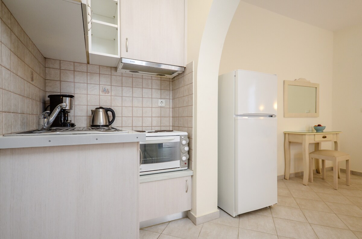 Apartament znajduje się w spokojnej okolicy, w odległości 10 minut spacerem od portu i starego miasta Parikia. Apartament jest idealny dla 2-3 osób z w pełni wyposażoną kuchnią. Posiada podwórko z ładną częścią wypoczynkową otoczoną kwiatami, idealne miejsce na relaks i poranną kawę. Jest też ścieżka prowadząca do morza na szybkie nurkowanie i doskonały widok na zachód słońca. Przy drodze znajduje się przystanek autobusowy ułatwiający transport.