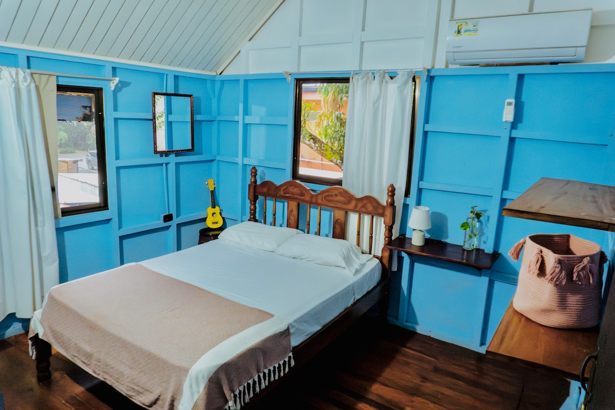 The 2 Bedroom Tree House is on the upper level of a 2 story house, (level with the trees for animal sightings), and has 1 bathroom, 2 covered verandas, one with a BBQ and comfy chairs and another with open air kitchen, dining table and comfy seating Bedrooms have fans also for people who don't like AC. This house looks towards ocean and pool and is great for a family of 4/5 One bedroom is air conditioned, the other is surrounded with windows and benefits from the tropical breezes.