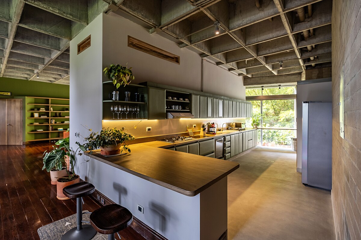 • Amazing location in heart of Poblado: "Oasis in the middle of the best part of the city, walking distance to everything” • Modern, fully furnished Loft • Sleeper sofa • High speed 100 Mb WiFi • Loads of nature around • On-site staff to help you with your needs 24/7 • A/C • Private Hot Tub • Pool in the common areas • Balcony w/ great views • 5 mins walk to best restaurants, cafes, malls. 15 mins walk to Poblado and Lleras Park • Fully stocked kitchen • 43” Smart TV w/ Apps • Transparent prices