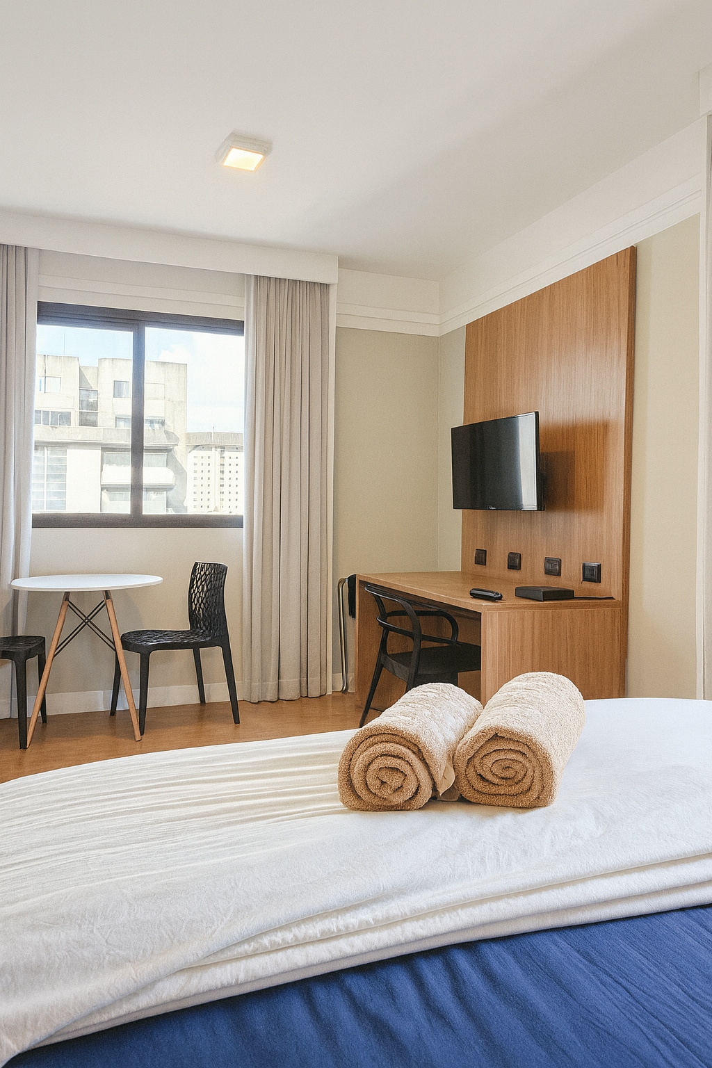Flat completo no coração de Alphaville, ideal para trabalho ou descanso. Ambiente moderno e aconchegante, com cama queen, TV, ar-condicionado e mesa de trabalho. Cozinha americana equipada com cooktop, micro-ondas e frigobar. Banheiro amplo com bancada em mármore e box de vidro. Inclui garagem coberta e Wi-Fi. Localização privilegiada, próxima aos principais centros de eventos, shoppings e restaurantes da região.