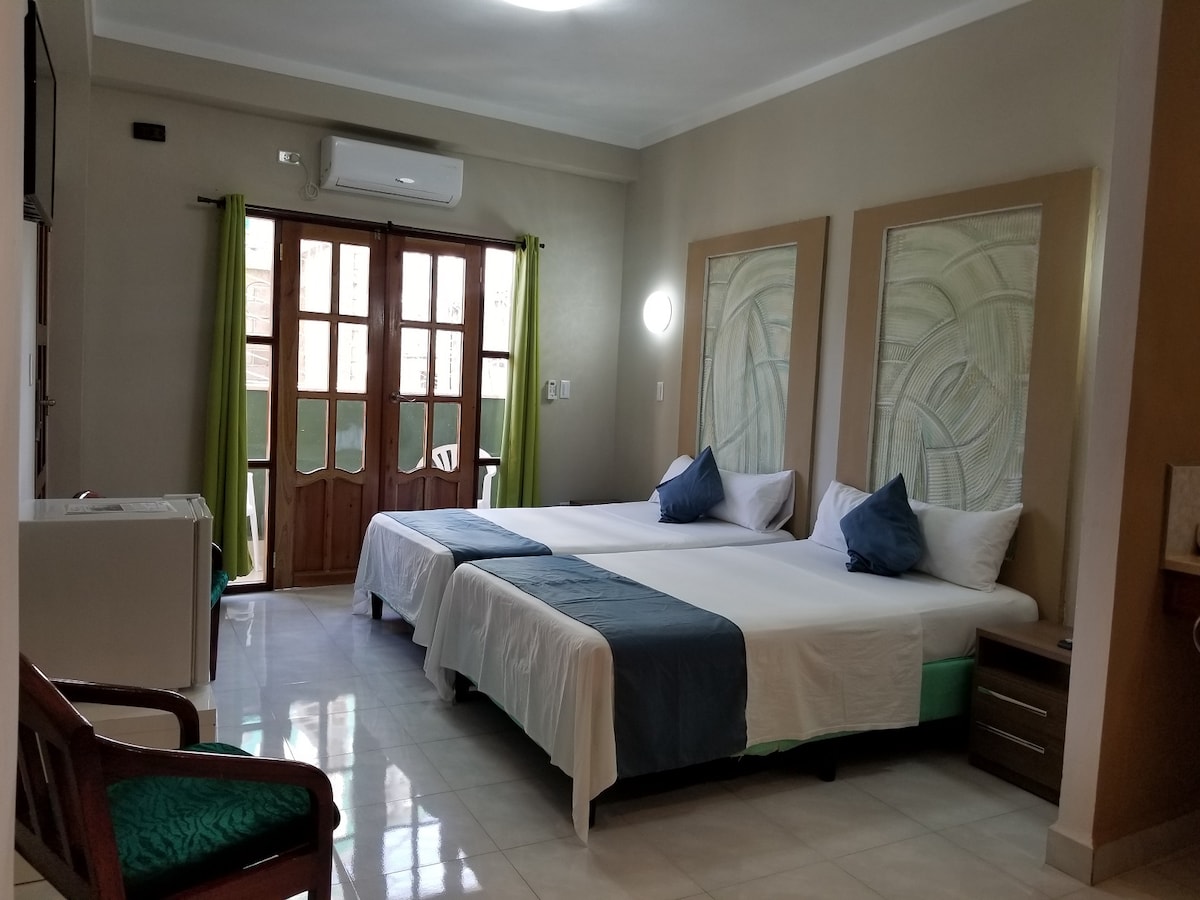 Habitación con entrada independiente y Wifi 24 horas en la 2da planta de nuestra casa con llave privada para los huéspedes, cuenta con 1 habitación para 3 personas con 2 camas, baño privado con agua caliente/fría, aire acondicionado, cocina, terraza privada al aire libre y cubierta de una mata de uva. Se encuentra en un barrio tranquilo de nuestra ciudad, frente al Teatro Heredia y a unos 200m de la Plaza de la Revolución, igualmente del Centro Comercial La Gran Piedra.