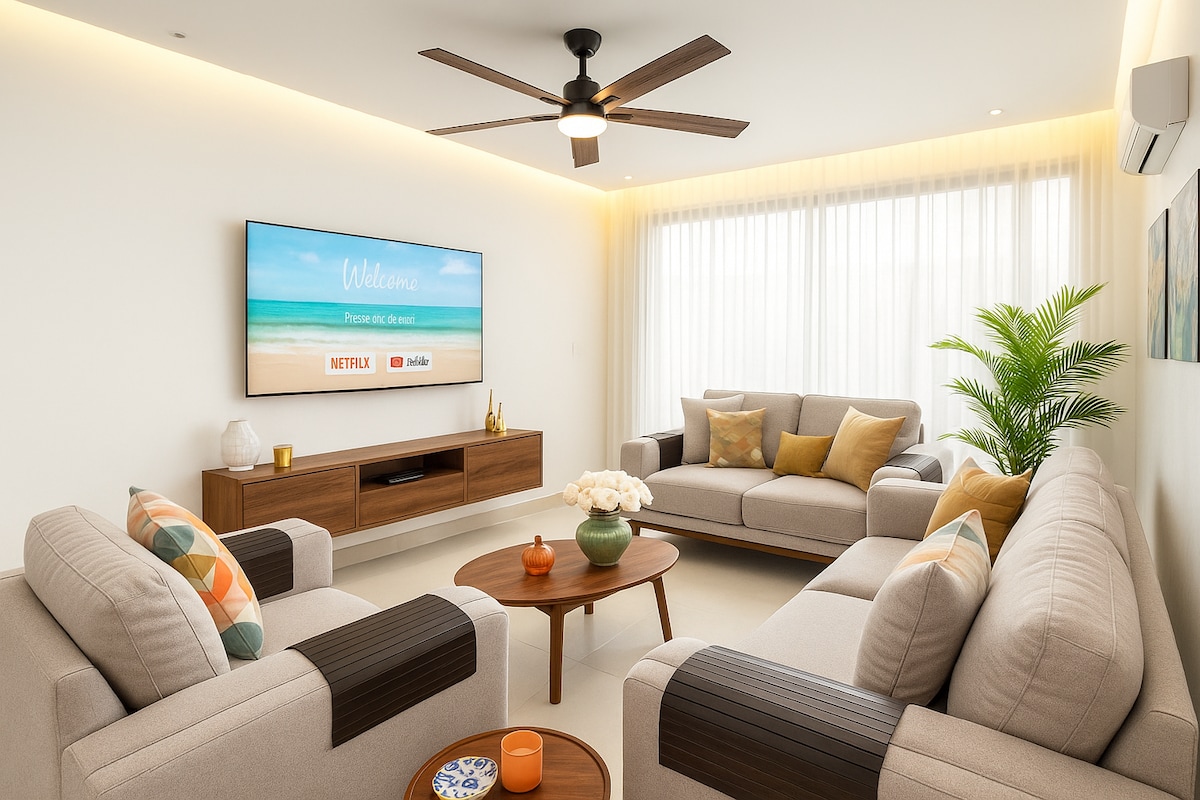 Enjoy our modern family apartament with 3-bedroom, perfectly located very close to the airport. Relax by the pool, work out in the gym, enjoy a cozy movie night in the cinema lounge, orna sunset in our terrace on the 12th floor with stunning city views The apartment features fast Wi-Fi, 4 A/C units, 2 parking spaces, and access to a kids’ play area and 24/7 security. Managed by Dolce Vita Luxury Property Management, specialists in stays and exceptional guest experiences across Santiago