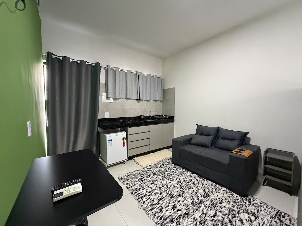 Wygodny pobyt w tej cichej, dobrze położonej kawalerce. Oferujemy pościel i pościel kąpielową oraz kuchnię wyposażoną w niezbędne przybory, aby można było spokojnie gotować. Telewizor jest obrotowy i wyposażony w system SMART z dostępem do Netflixa i innych aplikacji. Wystrój naszego domu to połączenie wysokiego standardu i swobodnej wygody. 6 minut od placu uniwersyteckiego 9 minut od dworca autobusowego i Polo Mode 44 9 minut od centrum Goiânii 18 minut od lotniska 9 minut od stadionu Serra Dourada