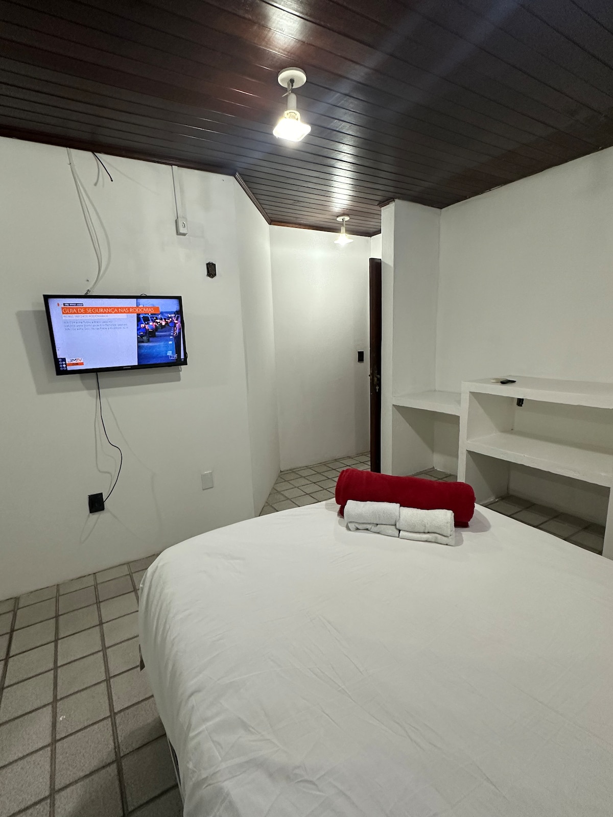 Pokój prywatny z łazienką i klimatyzacją. Idealne dla tych, którzy szukają cichego i centralnego miejsca na pobyt w centrum São Luis. Jak widać na zdjęciach oferty, oferta jest przestronna, przewietrzona, z oknem wychodzącym na podwórko. Posiada podwójne łóżko i pojedyncze łóżko, które może służyć jako dodatkowa sofa lub pojedynczy materac, który może pomieścić innego gospodarza dla maksymalnie czterech osób. Znajduje się tu również minibar, stół z krzesłami i półkami.