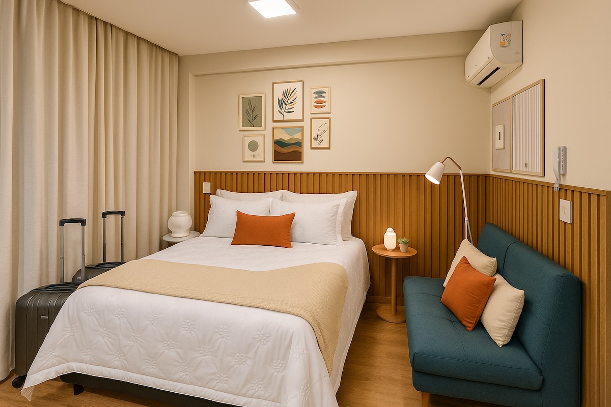 Studio o powierzchni 26 m² z wystrojem zaprojektowanym przez architektkę w sercu dzielnicy Jardins. Przytulna atmosfera, idealna dla osób podróżujących samotnie, z przyjaciółmi, dla par i rodzin z dziećmi! Możemy przyjąć do 4 osób, zapewniając im komfort i wszechstronność Znajdujemy się 3 minuty od słynnej ulicy Oscar Freire: bezpieczna, pełna restauracji, sklepów, aptek i targowisk W centrum miasta, idealne dla tych, którzy chcą zwiedzić najważniejsze punkty miasta, takie jak Park Ibirapuera, Aleja Faria Lima i inne