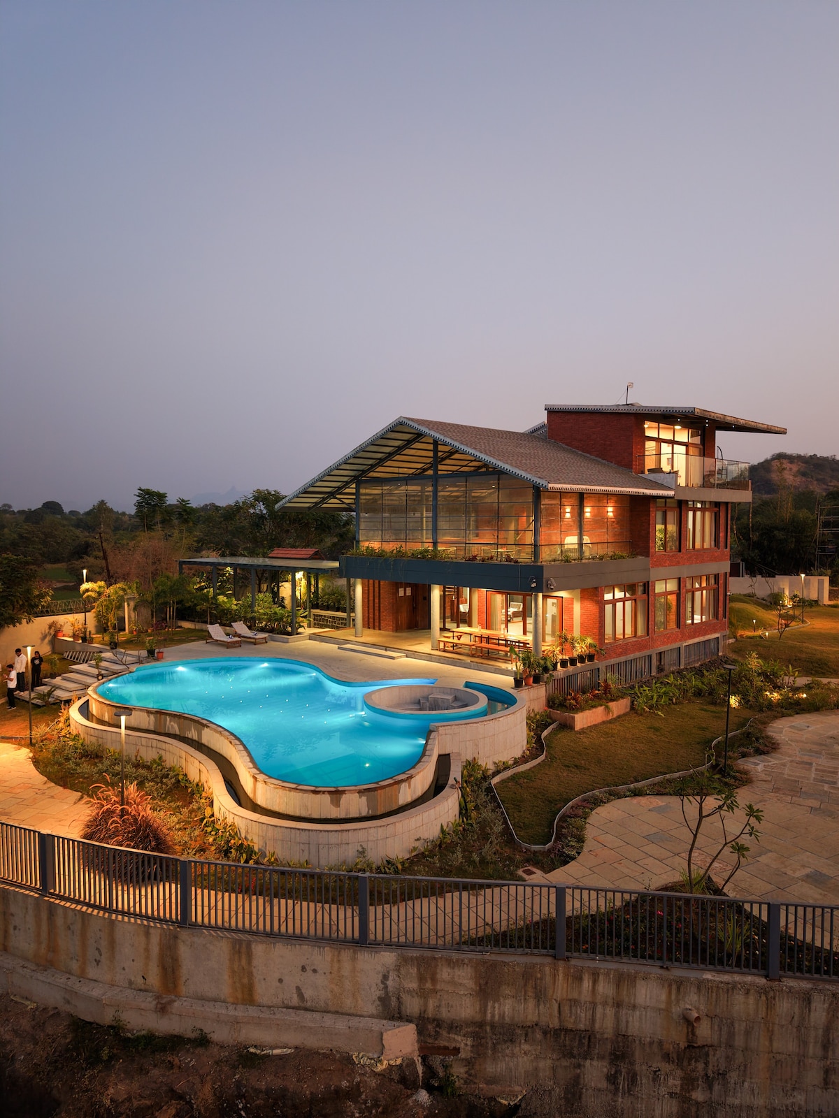 Poznaj wyrafinowany luksus tej nowoczesnej willi z prywatnym basenem, gdzie współczesna architektura łączy się z naturą. Ekskluzywne mieszkanie 3BHK w pobliżu Igatpuri 50 minut od Nashik i 3,5 godziny od Bombaju komfortowe miejsce dla 6–9 osób. Czeka na Ciebie prywatny basen, gry wewnątrz i na zewnątrz, amfiteatr na wieczory filmowe, w pełni wyposażona kuchnia, szef kuchni na miejscu (za dodatkową opłatą) i przyjazne zwierzętom wyposażenie, idealne na rodzinne wyjazdy i uroczystości.