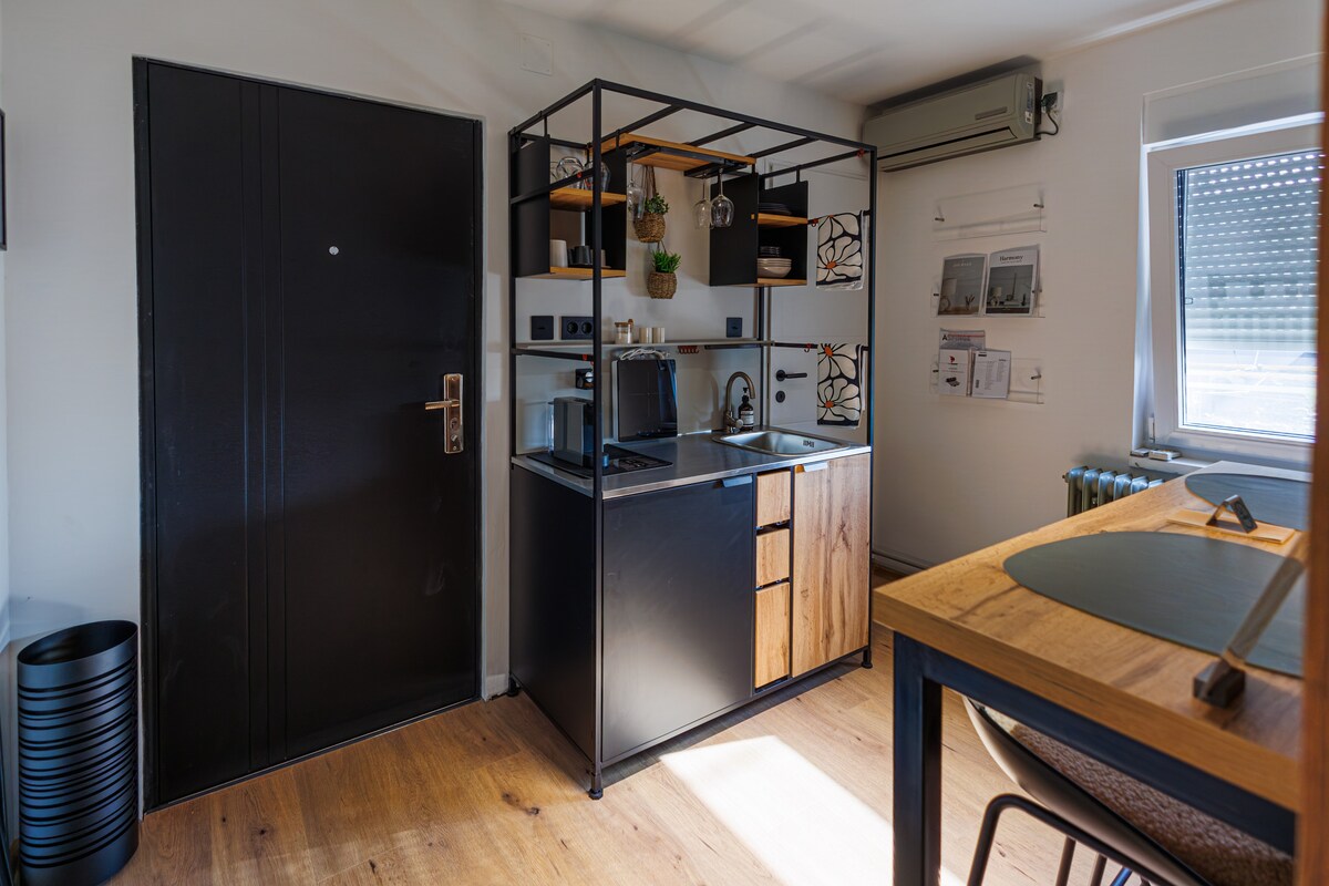 Odpręż się w tym przytulnym i stylowym miejscu. Apartament typu studio składa się z kuchni z jadalnią i miejscem z łóżkiem. Mała łazienka jest oddzielona drzwiami. Studio jest niedawno odnowione i w pełni wyposażone, klimatyzowane i ma niezapomniany internet WiFi. Jeśli wymagany jest parking, wymagane jest zarezerwowanie go przy rezerwacji apartamentu (znajdującego się w garażu podziemnym dworca autobusowego), a karta jest dostępna do bezpłatnego użytku.