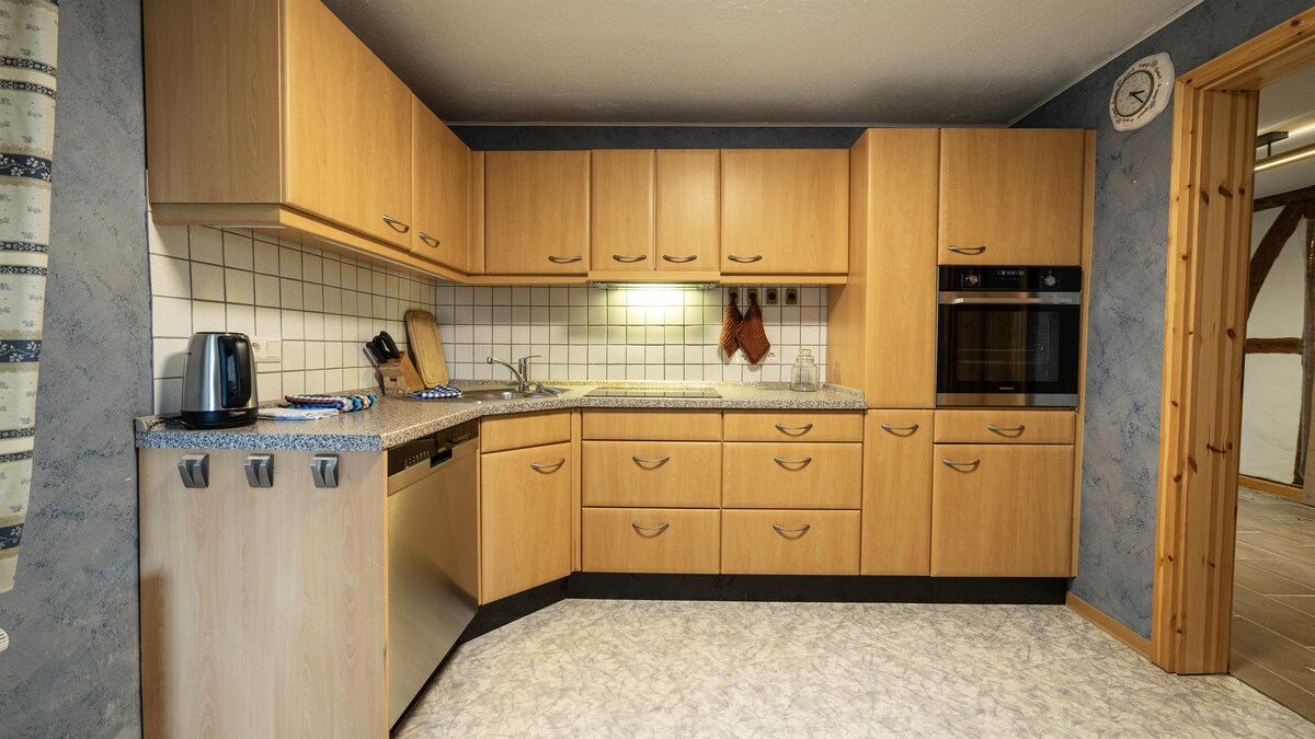 Du bewohnst ein Haus in einem denkmalgeschützten Fachwerkensemble von 1774 in direkter Umgebung von Detmold, ausgestattet mit Fittnes, Kino, Gartenlaube und freiem Blick auf den Teutoburger Wald. Komplette Küche, Infrarotsauna, gemütliche Stube mit Ofen- und Elektroheizung. Schlafzimmer mit Lehmwänden, ein zweites unter dem Dach. Garten vor dem Haus zur alleinigen Nutzung. Kinder und Haustiere willkommen. Supermarkt 1,1 km, City 3,5km entfernt. Elektrische- oder Ofen- Heizung Brennholz incl.