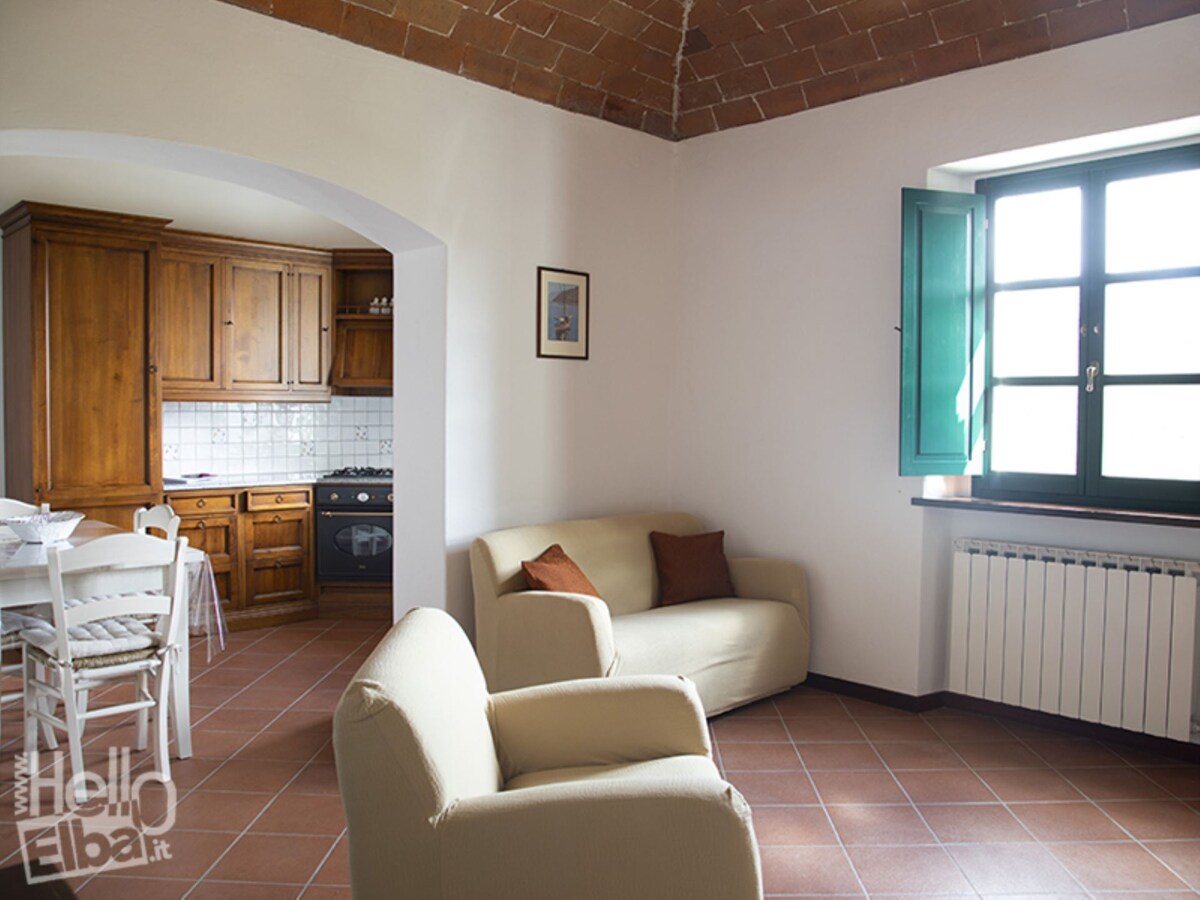 Appartamento recentemente ristrutturato, in posizione strategica e centrale, a 4 km. da Portoferraio e dalla spiaggia delle Ghiaie, a 5 km. dalla spiaggia di sabbia della Biodola e a 1 km dalla famosa Villa di Napoleone. L'ampio monolocale per due persone si trova al primo piano ed è composto da un unico vano con angolo cottura con forno elettrico, frigorifero con freezer capiente, comodo spazio con letto matrimoniale provvisto di ventilatore, bagno con doccia, lavatrice. Posto auto privato.