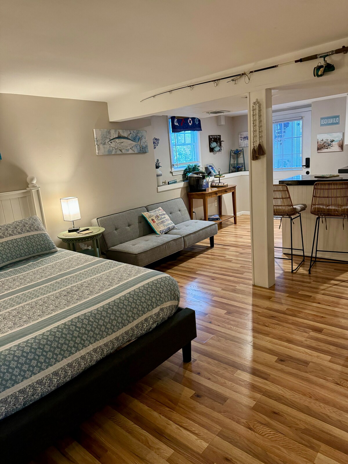 Magical ALL year ‘round. location, Location, LOCATION; comfy, contemporary newly renovated (‘21) private bedrm & family rm 0.4mile from neighborhd river-beach, 0.9mi from row of ocean beaches, hiking trails, live theater, everywhere. Separate private entrance. A/C. Queen bed. Outside space with picnic table, chairs, & hammock. Beach chairs provided. W/in 5 min walking distance of bakeries, mini-golf, restaurants, shopping, bike trail, kayaking, & more.