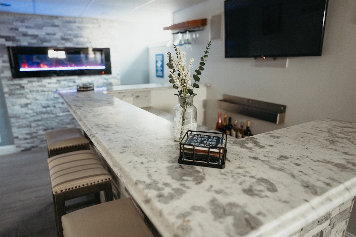 🌟 Spokojny komfort w pobliżu brzegu! Odnowiony apartament z 2 sypialniami, w odległości krótkiego spaceru (0,4 mili) od plaż, szlaków, sklepów i rozrywki. Zrelaksuj się w jacuzzi, zrób grilla pod pawilonem lub przytul się przy kominku. Długie pobyty = duże zniżki do 50%! 💻🔥🏖️ W ZESTAWIE SZEŚĆ SEZONOWYCH KART WSTĘPU NA PLAŻĘ OCEAN GATE BEACH I 2 KARTY WSTĘPU DO PARKU WODNEGO SPLASH PAD!!!