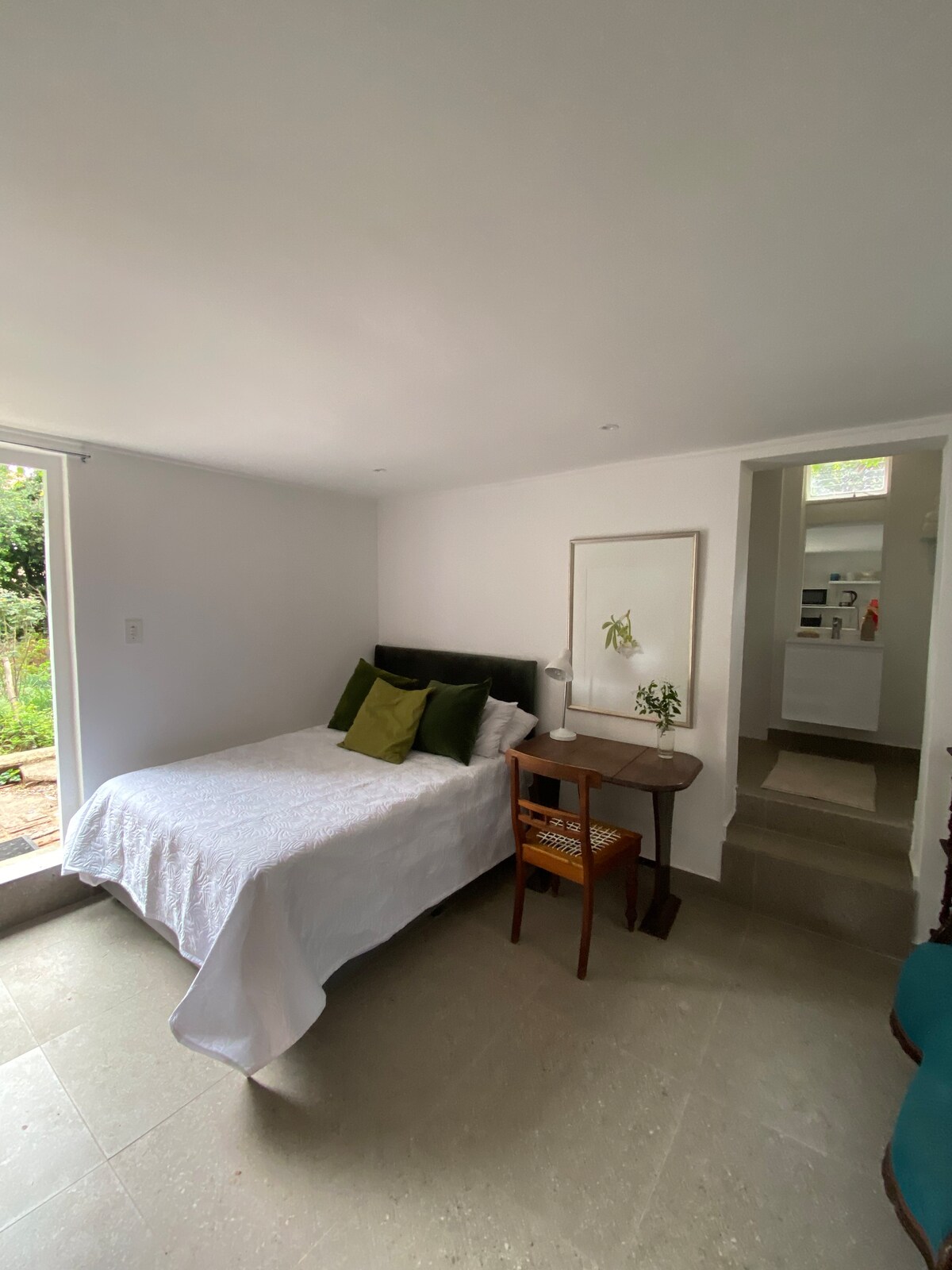 Garden cottage is a small open plan space-opens onto a vegetable garden- providing a green private space for the guest. Your access it down a lane from the street- which is enclosed with 24 hour security- so completely safe to park car on street. Laundry can be done and dried for R150 a load. Tea, coffee, milk and sugar provided. The room will be serviced every week day. Arrangements can be made with the owner to use the private pool.