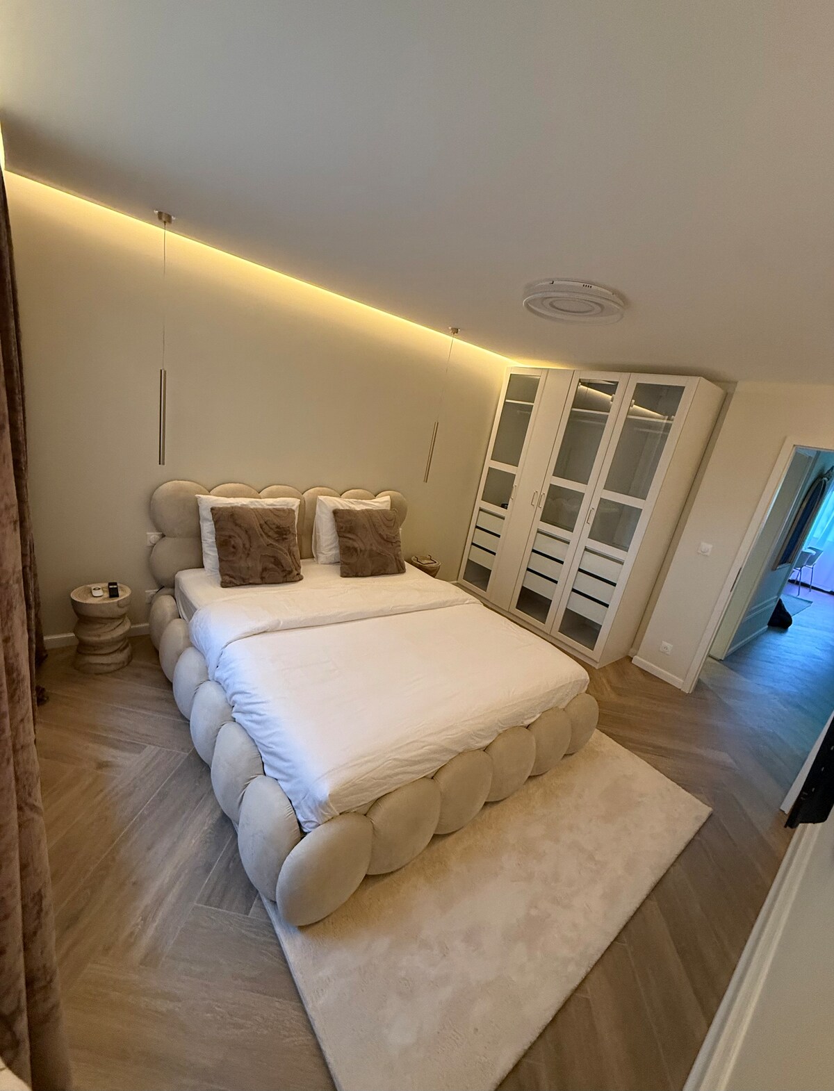 To mieszkanie prezentuje zdecydowanie unikalny styl. Apartament wysokiej klasy zapewnia chwile relaksu i intymności w luksusowym otoczeniu. Salon otwarty na kuchnię wyposażony w gigantyczny projektor wideo i kino domowe, aby w pełni zanurzyć się w relaksującym wieczorze. Przestronny pokój z łóżkiem typu QueenSize (160 x 200) zapewnia komfort. Luksusowa łazienka z kabiną prysznicową z jacuzzi dla 3 osób i sauną dla 3/4 osoby z bezpośrednim dostępem do pokoju.