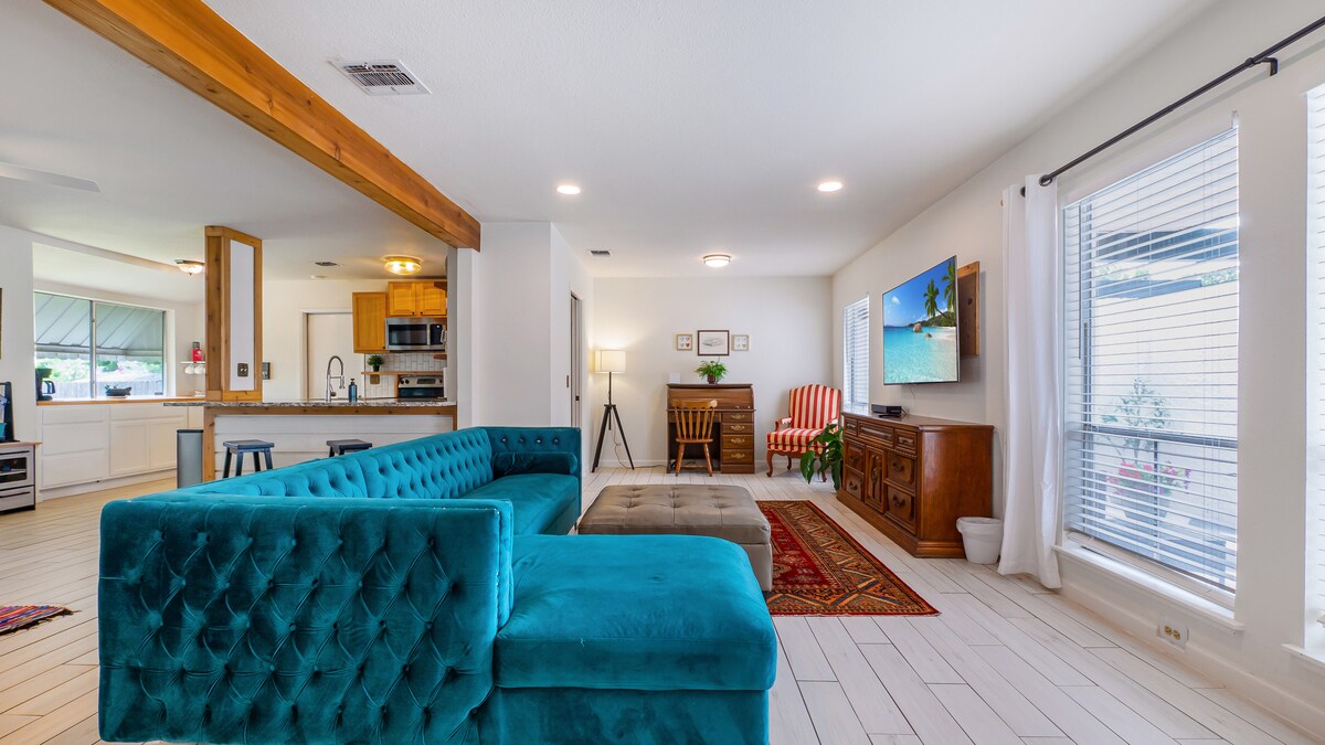 Witaj w Serene Views – Twoim prywatnym, luksusowym miejscu wypoczynku z basenem w stylu kurortu, zaprojektowanym z myślą o rodzinach z dziećmi, wyjazdach grupowych i dłuższych pobytach. Ten designerski dom z 5 sypialniami i 3,5 łazienkami w Schertz może pomieścić 10 osób i posiada prywatny basen, pokój gier i stylowe pomieszczenia dzienne. Kilka minut do bazy lotniczej Randolph i w promieniu podróży do bazy lotniczej Lackland. Korzystaj z Wi-Fi, w pełni wyposażonej kuchni, pralki/suszarki i wygody dla zwierząt domowych, aby zapewnić sobie bezproblemowy, relaksujący pobyt.