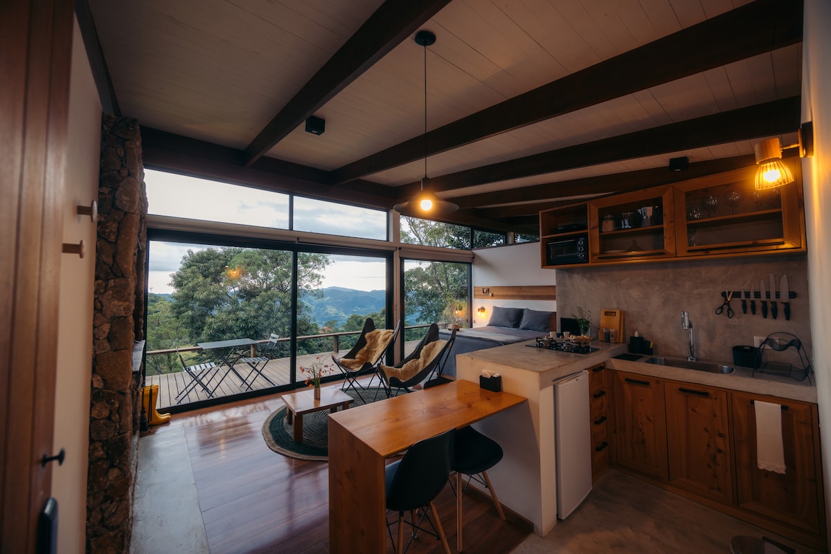 Odkryj urok Serra da Mantiqueira w tej chacie zaprojektowanej tak, aby można było kontemplować wschód słońca bez wstawania z łóżka. Zrelaksuj się w naszym ogrzewanym spa, obserwując gwiazdy nad głową i huśtając się. W kabinie znajduje się zintegrowany pokój z przytulnym łóżkiem typu Queen. W salonie/kuchni bardzo wygodny futon pomieści jeszcze dwóch gości, dzięki czemu atrakcja jest idealna dla rodzin. Na terenie posesji znajdują się również szlaki i małe wodospady.