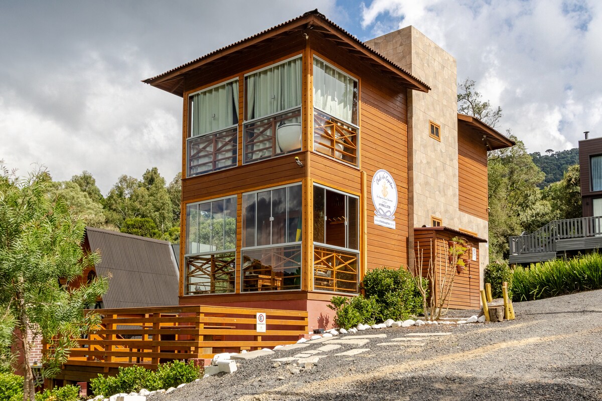 Przeżyj niezapomniane chwile w tym wyjątkowym miejscu idealnym dla par i rodzin. Znajduje się ono w Morro da Igreja, w kontakcie z naturą, na wysokości około 1500 metrów, z zapierającym dech w piersiach widokiem na dolinę, idealnym do Twoich postów i streamingu. Nasz domek górski został zaprojektowany tak, aby zapewnić gościom komfort, luksus i prywatność, z romantycznym i nowoczesnym akcentem. Z wanną z hydromasażem i chromoterapią z widokiem na dolinę oraz jacuzzi na tarasie, wszystkie ogrzewane gazem.