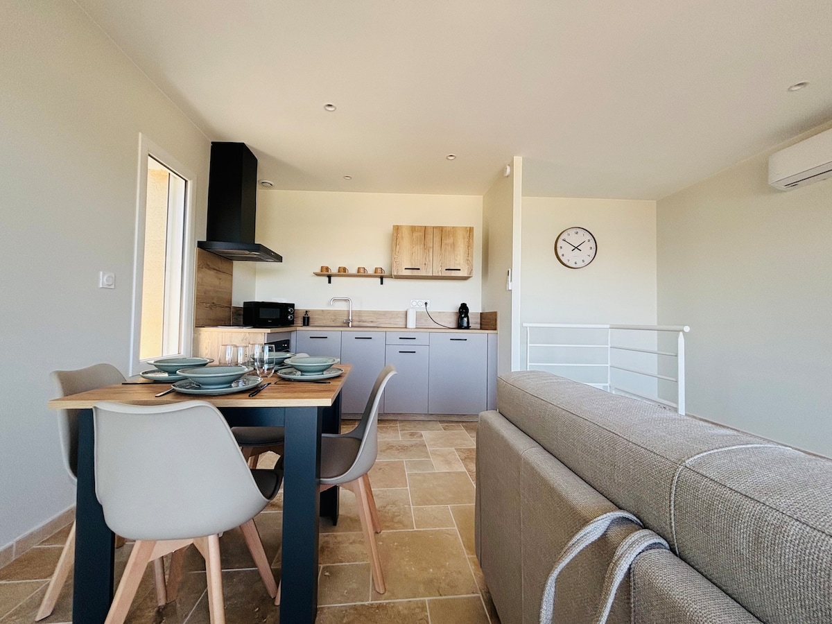 Apartament położony jest na południu Isère Rhodanienne, 2 km od autostrady A7. Sąsiaduje z naszym domem, ale jest całkowicie niezależny. Jego powierzchnia wynosi około 35 m2 na 2 poziomach. Na parterze znajduje się pokój dzienny z aneksem kuchennym i salonem, oświetlony przez duży przeszklony dach wychodzący na dziedziniec. Z tyłu znajduje się sypialnia z podwójnym łóżkiem. Na piętrze znajduje się antresola z kolejnym podwójnym łóżkiem oraz łazienka/toaleta. Otoczenie jest spokojne, a basen jest ogólnodostępny.