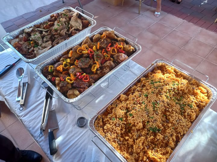 Menu przygotowane na Twoją imprezę, zawierające 1 rodzaj białka (kurczak lub wieprzowina), 1 rodzaj węglowodanów, 1 rodzaj warzyw lub sałatkę, 1 deser, 1 napój bezalkoholowy na osobę (mrożona herbata, Sprite lub cola)
