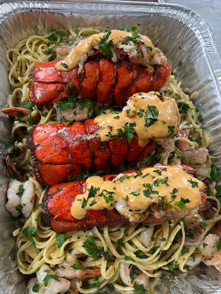 Mamy różne opcje kolacji, ale ta to grillowany ogonek homara na linguine z owocami morza