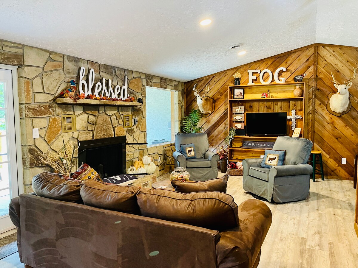 Cozy house with 3 bedrooms 2 baths,walk in shower, fire place, hot tub,fully stocked kitchen,TV in every room. Private pond down the drive way, watch the sun rise on the front porch with beautiful views, or sip a cup of coffee on the back patio with views of bluff mountain. 10 minutes from downtown Pigeon Forge, 20 minutes from downtown gatlinburg and smokey mountain National parkway. (There is temporary construction currently near property and home pics in photo, you may experience noise)