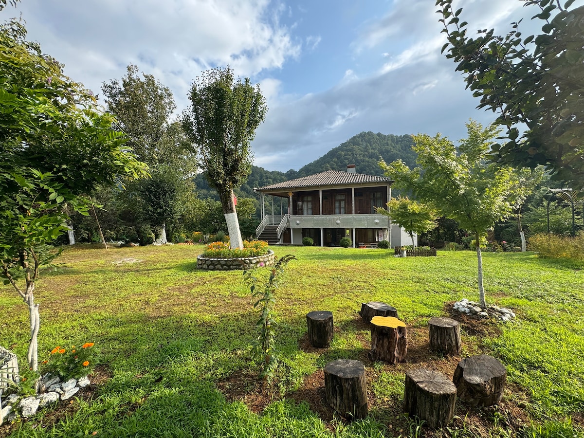 Chata z dwuspadowym dachem zanurzona w przyrodzie Gurii, kilka metrów od rzeki i w drodze do góry Gomi. Kuchnia na zewnątrz, toaleta i gorący bambusowy prysznic. Bezpłatny parking, Wi-Fi, zajęcia na świeżym powietrzu i wspólna otwarta przestrzeń.