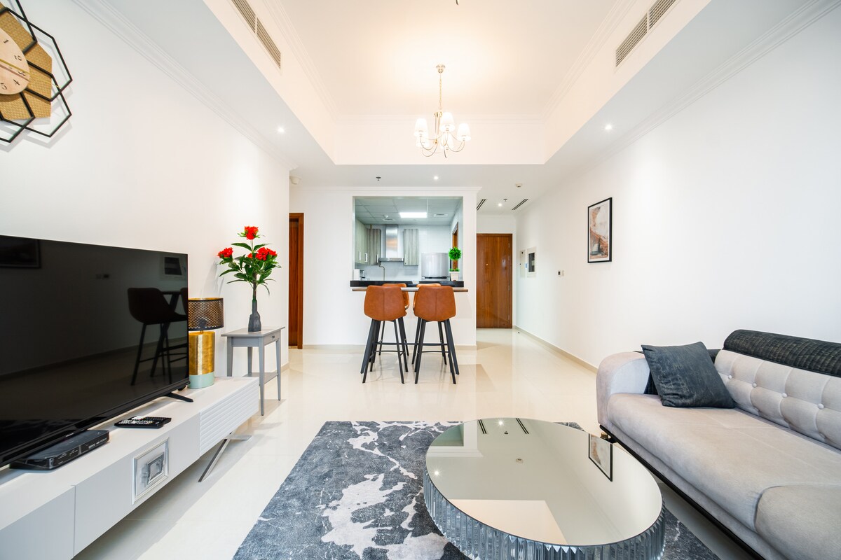 Jasna i przestronna sypialnia oraz apartament z gabinetem z bardzo dużą częścią dzienną, kuchnią IKEA, czystą łazienką i pięknymi widokami! Na naszym balkonie jest Twoje imię i nazwisko na poranną kawę. Stylowe nowe meble i wysokiej jakości pościel hotelowa. 7 minut spacerem do plaży z niesamowitym wyborem restauracji, kawiarni i barów, nie wspominając o plaży! 6 minut spacerem do tramwaju, który łączy się z metrem i resztą Dubaju 15 minut spacerem do Marina Mall Idealna lokalizacja Basen bez krawędzi, siłownia, miejsce do grillowania, korty do squasha