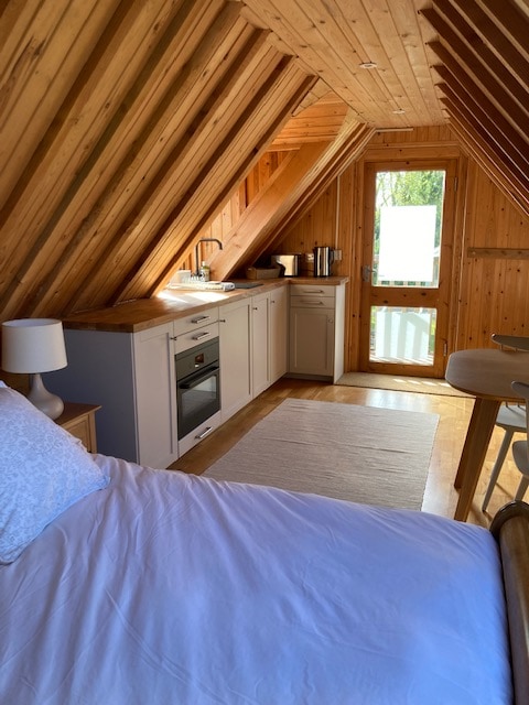Duża, przytulna rustykalna 1-pokojowa chatka z oddzielnym prysznicem elektrycznym, toaletą i aneksem kuchennym. Duże łóżko. Oszałamiające widoki na okolicę, położone w prywatnym padoku dla zwierząt na szczycie naszego ogrodu. Fantastycznie nadaje się do spacerów z psem. Znajduje się na wiejskiej drodze w AONB. Położony między 2 wioskami z pubami i sklepami, do jednej można łatwo dojść na piechotę, ale zaleca się samochód lub rowery. Znajdujemy się między północnym i południowym wybrzeżem, więc w pobliżu są wspaniałe plaże, a także dwa parki narodowe, Exmoor i Dartmoor.