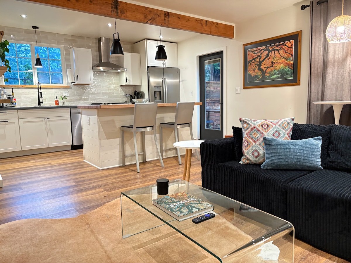 Remodeled cabin nestled in a redwood grove near the south end of the "Avenue of the Giants" in the town of Miranda. Perfect location to unwind after a long day exploring the Avenue. Enjoy the large luxurious tile shower with rainfall shower head & body sprayers, hotel style bed & fully equipped chef's kitchen w/ premium appliances including a Breville Vertuo coffee machine with coffee pods and tea selection. Walking distance to grocery store and restaurants. Fenced back patio w/ pvt hot tub