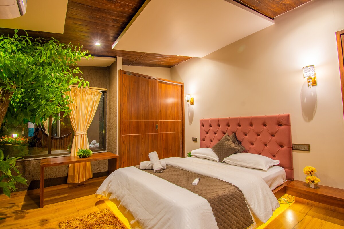Poczuj magię Arowana Chalet, luksusowej willi w szwajcarskim stylu w Lonavali. Ciesz się przytulnymi drewnianymi wnętrzami, prywatnym basenem z widokiem na góry i pyszne posiłki przygotowane przez naszego pełnoetatowego szefa kuchni (wliczone w cenę, wystarczy zapłacić za artykuły spożywcze i nominalne opłaty za gaz). Zakończ dzień na grillu na świeżym powietrzu i połóż się w naszych wygodnych łóżkach, aby ostatecznie obudzić się o wschodzie słońca tak pięknym, że będziesz żałować, że nie zarezerwowałeś dodatkowego dnia w willi!