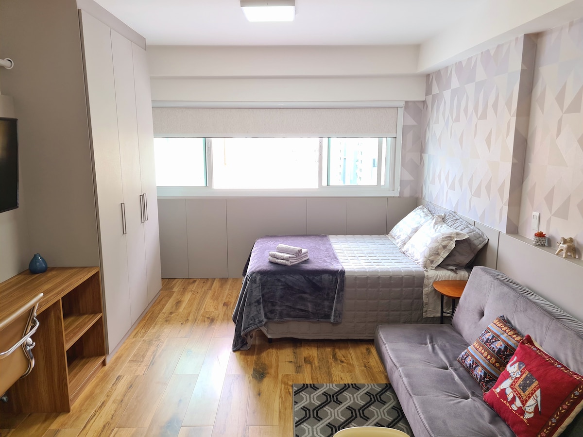 Studio moderno e totalmente equipado. Está em excelente localização, próximo aos melhores Shoppings, restaurantes, centro comercial, diversos pontos turísticos e parques. Fácil acesso ao transporte público e vias de acesso. As parte externas foram pensados para proporcionar à você uma estadia agradável e inesquecível. Tem piscina aquecida (precisa atestado médico) sauna e academia. Meu espaço é ideal para casais ou famílias, assim como para viajantes de negócios. Temos estacionamento incluso