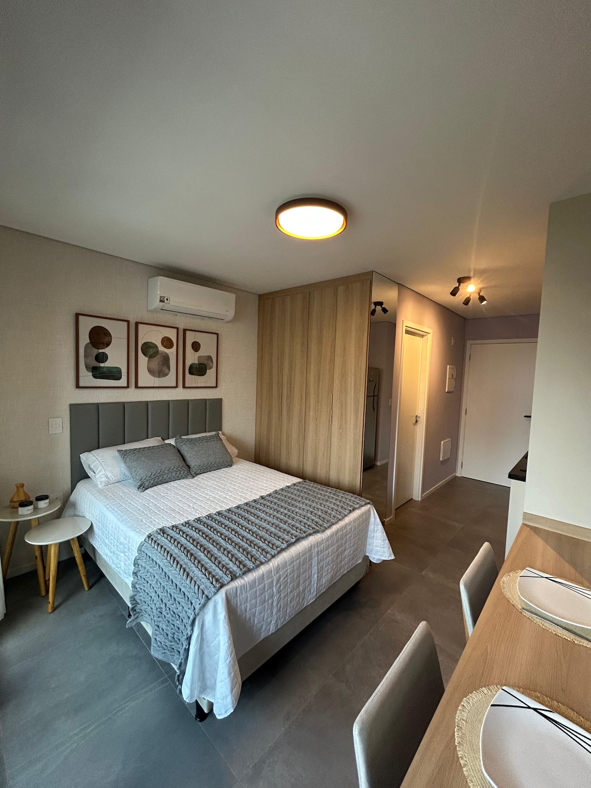 Estúdio moderno e ensolarado com cama queen size