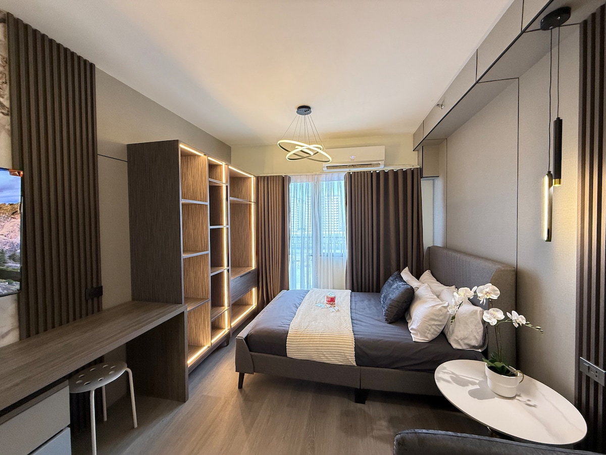 Wkrocz do swojego prywatnego luksusu w Shore 2, Tower 2 Residences w Pasay. Zaledwie kilka minut spacerem od SM Mall of Asia, MOA Arena, to przytulne, a jednocześnie stylowe studio oferuje komfort domu z atmosferą hotelu butikowego. Dzięki miękkim teksturom, ciepłym akcentom z drewna i nowoczesnemu oświetleniu jest idealny na podróże służbowe, wypoczynek lub samotne wypady. Szybkie Wi-Fi, telewizor Smart TV, wygodne łóżko i udogodnienia jak w kurorcie – wszystko to pomoże Ci się zrelaksować, zregenerować i jak najlepiej wykorzystać czas.