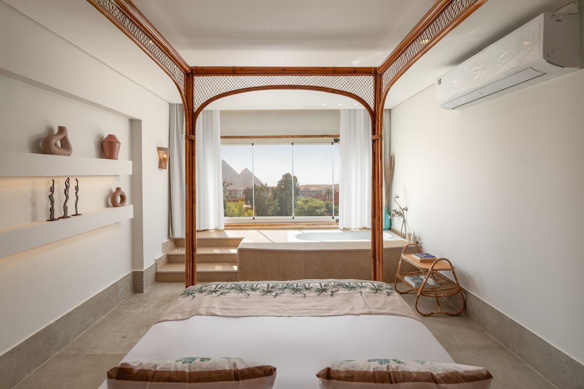 A designer retreat where ancient soul meets modern luxury. This hand-sculpted cave offers a meditative atmosphere with one legendary focus: The Great Pyramids. Relax in your integrated Jacuzzi and watch the sunset over the last remaining Ancient Wonder of the World. ✨