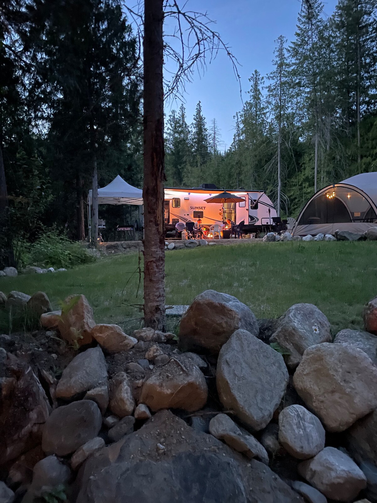 Duży ekskluzywny kemping rodzinny z Prywatne wejście Dużo miejsca na parkowanie przyczep do łodzi itp. 2018 26-stopowa przyczepa w pełni wyposażona w... Septyczna woda zasilająca 30 A Nocleg dla 4 osób, 5 osoba do negocjacji Przyjazne dla zwierząt Zadaszone kuchnie na świeżym powietrzu i bar z zlewem Osłonięty namiot ze stołami i krzesłami Klimatyzacja Smart TV, Stereo z Bluetooth Wspólna część prysznicowa z pralką, suszarką, toaletą, umywalką i prysznicem Kajaki i deski do wiosłowania dostępne na plaży Mara wzdłuż drogi
