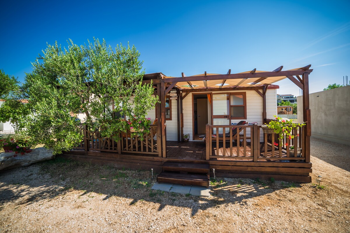 Mobile homes situated in the center of Pakostane right on to the main sandy beach with the direct view on the sea. Holiday home 5 has one bedroom, dinning area, kitchen, toilete and big terrace. Also parking place is provided for guests.