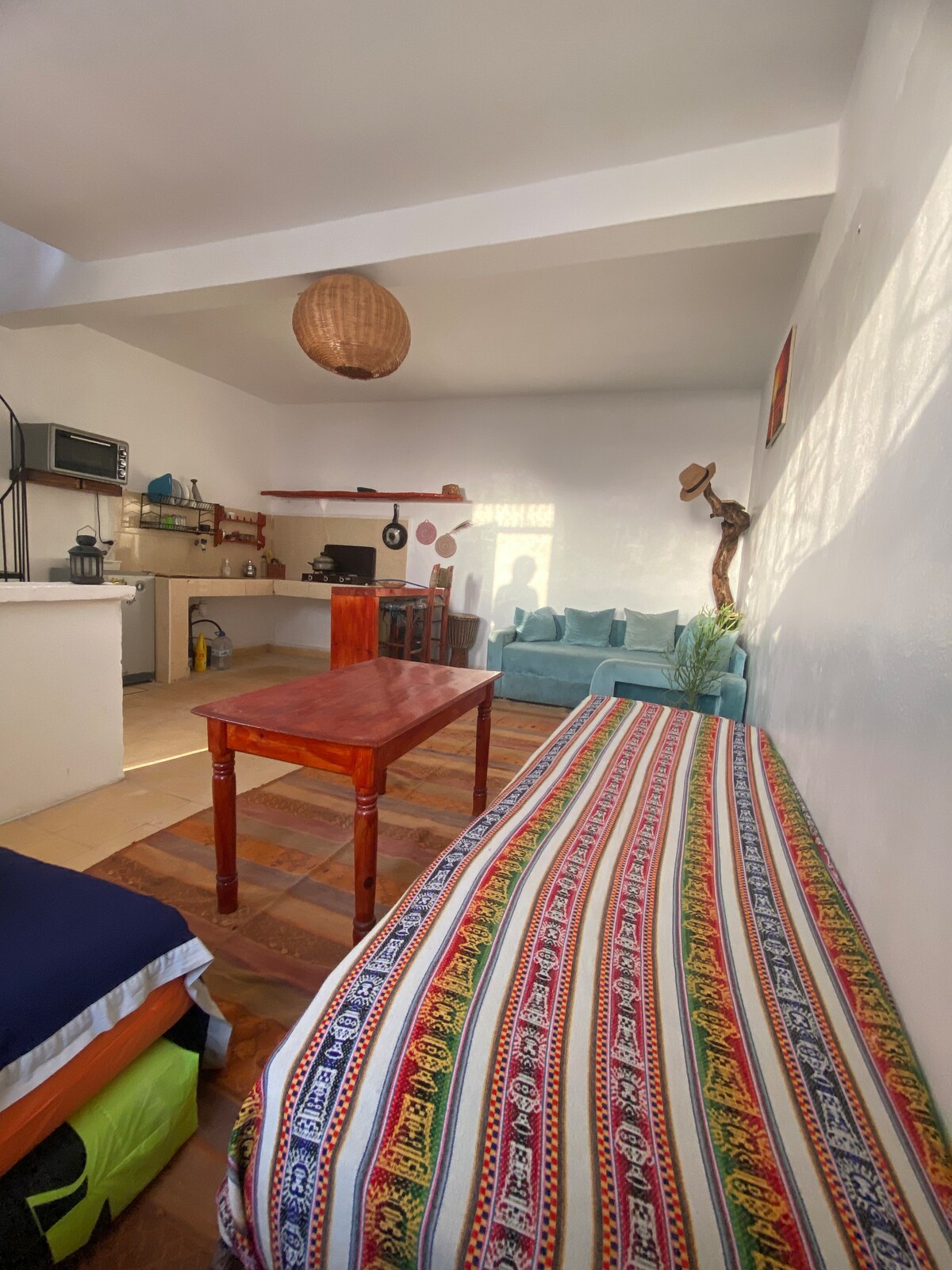 Bardzo jasne i wolne od wilgoci (bardzo rzadkie w medynie) studio o powierzchni 47 m2, z widokiem na południe, położone w spokojnej uliczce, kilka kroków od głównej ulicy. Studio znajduje się w pobliżu sklepów, targowiska, kawiarni i restauracji. Z tarasu na dachowego, również z wystawieniem południowym, roztacza się widok na plażę. Parking i dworzec autobusowy „supratours” (który łączy Essaouirę ze wszystkimi dużymi miastami) znajdują się w odległości 500 metrów, podobnie jak plaża i plac Moulay El Hassan. Idealne studio dla par